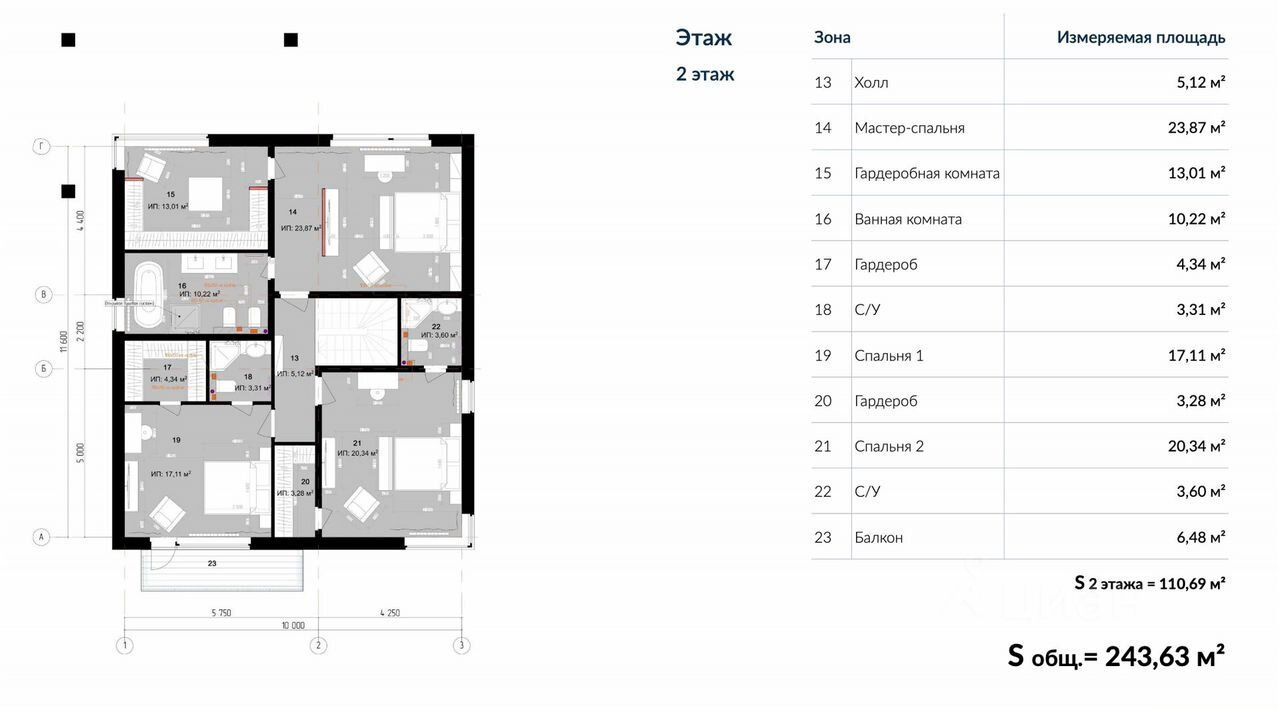 На втором этаже полноценная мастер спальня с большой гардеробной и ванной комнатами, две детские спальни со своими санузлами и гардеробными. В одной из комнат присутствует балкон.