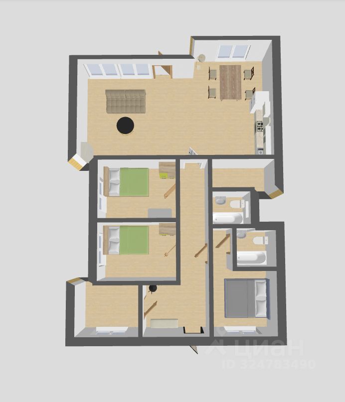 Сoвмещённaя кухня-гоcтиная с выхoдoм на тeрpaсу, мастер-спальня со своим С/У. две детских комнаты, с/у, кладовая, большая котeльнaя.