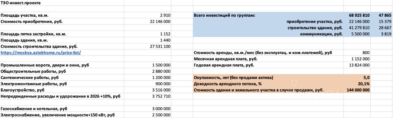 Ключевые финансовые показатели (без учета продажи актива): - объем необходимых инвестиций: 69 млн руб, включая стоимость приобретения земельного участка, капитального строительства и подведения коммуникаций. - среднегодовой арендный доход (GAP): 13,8 млн руб. (консервативный прогноз на основе рыночных ставок аренды в локации) - простой срок окупаемости (PBP): 5 лет. (стабильный пассивный доход после выхода на окупаемость) - готовая детализированная финансовая модель и ТЭО.