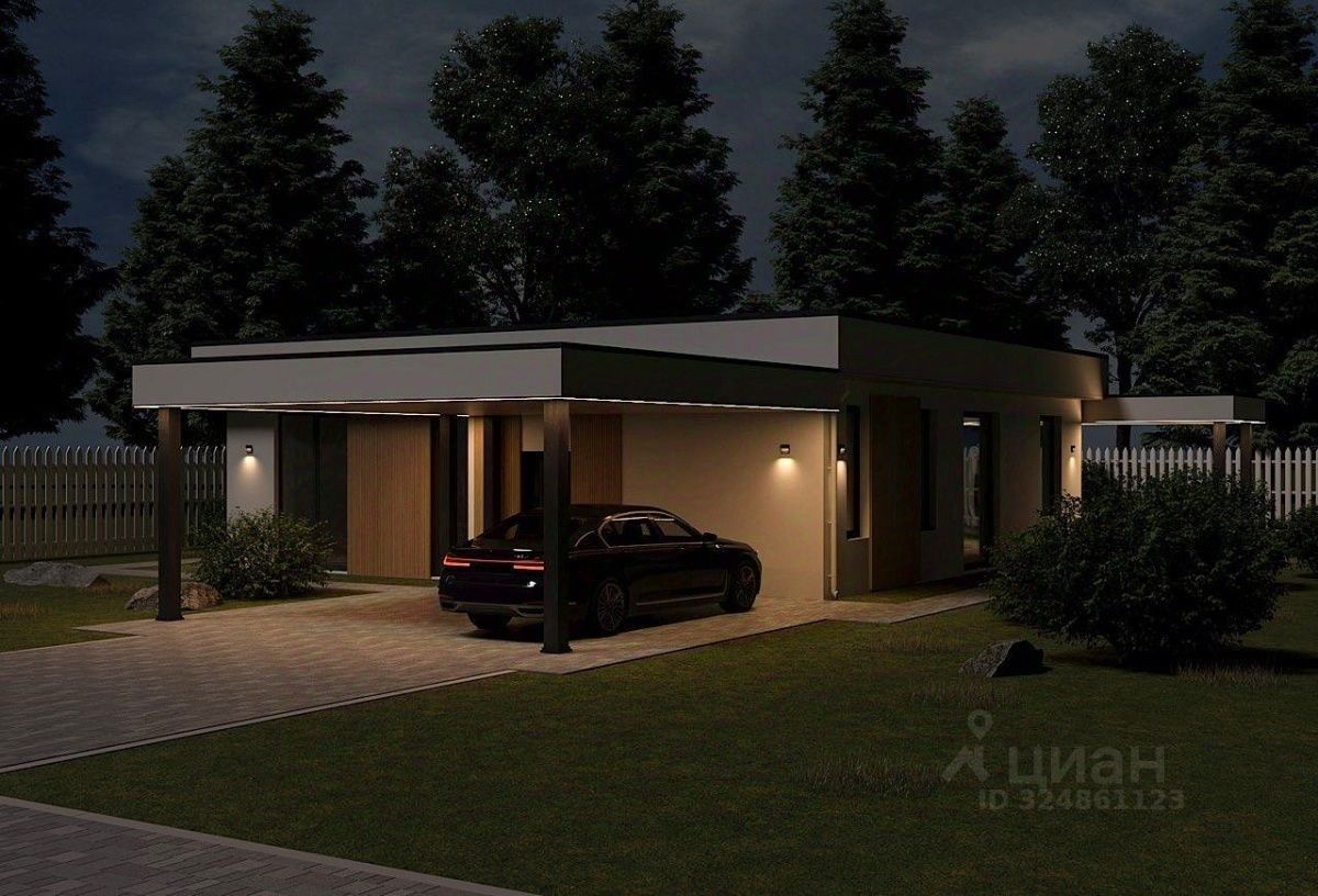Панорамные окна в пол. Высота потолков 3 м. Стены возведены из газобетонного блока D500 толщиной 400 мм. Наружная отделка с декоративными вставками из планкена. Фундамент монолитная плита с теплым полом. Плоская кровля.