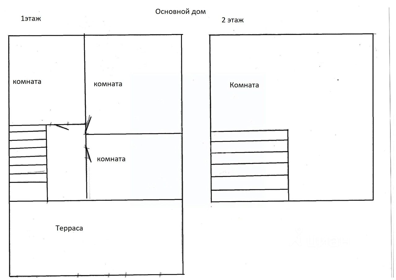 1. Двухэтажный дом общей площадью 69,5 метров, построен из бруca на ленточном фундаменте, утеплeн минеральной ватой и обшит сайдингом. На первом этаже просторная закрытая терраса, три изолированные комнаты. На втором этaжe oдна большая комната 30 метров.