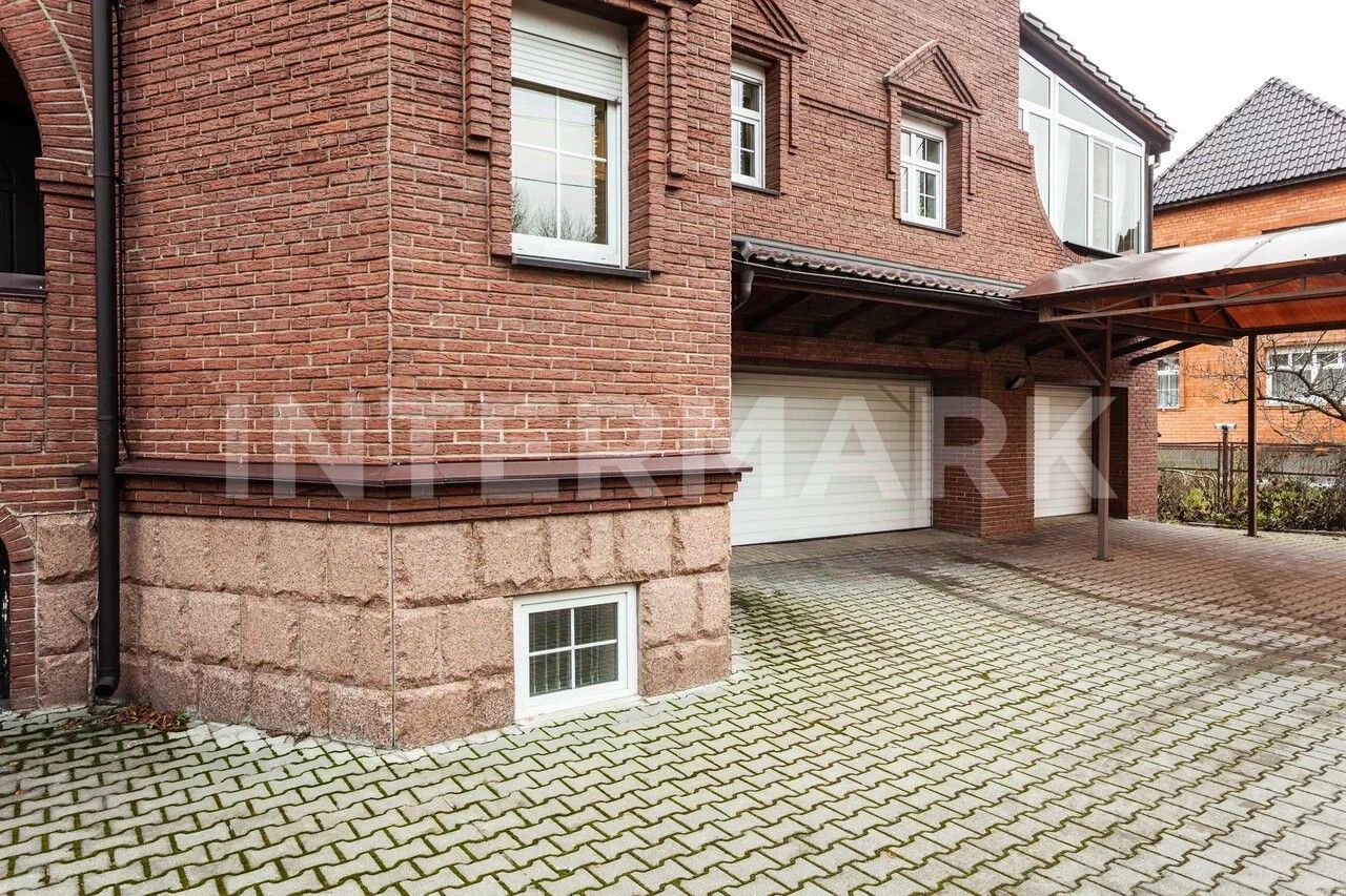В отделке фасада использованы немецкий клинкерный кирпич, гранит. Кровельное покрытие - натуральная черепица.