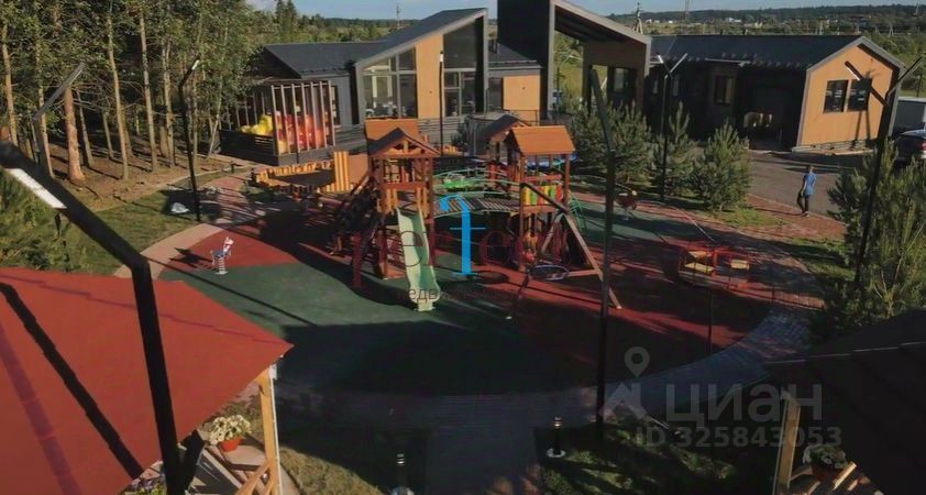 Большая парковая зона внутри поселка, детская площадка с огромной игровой зоной, качелями, батутом и песочницей.