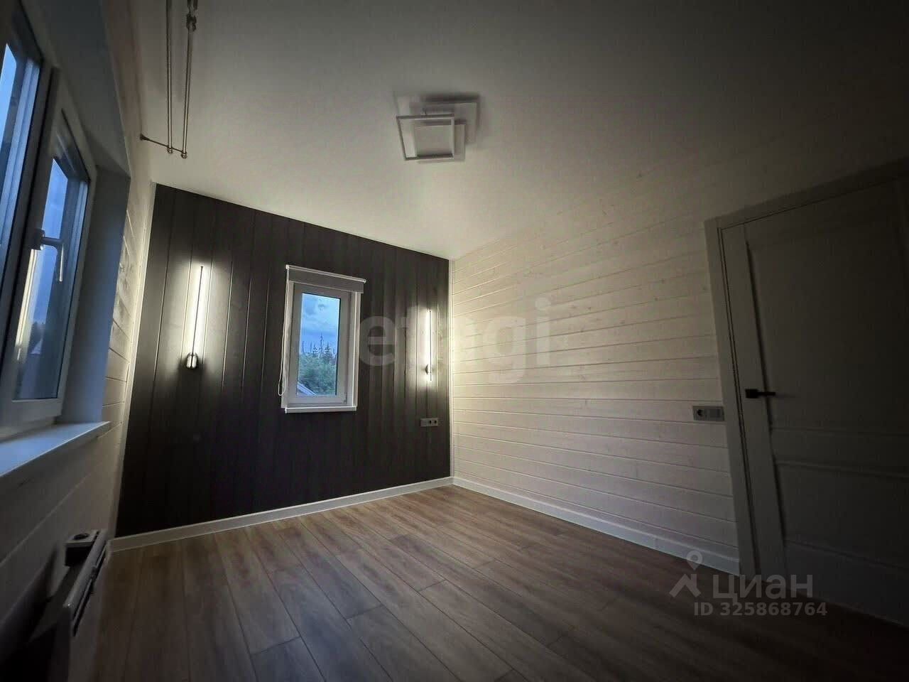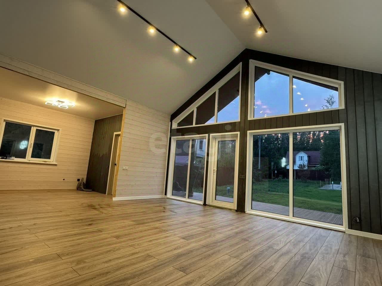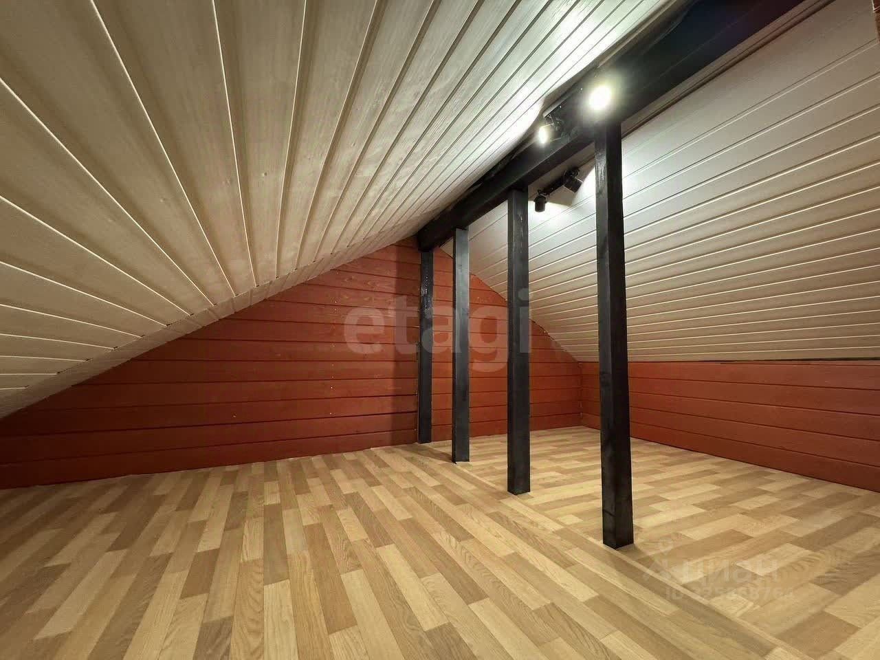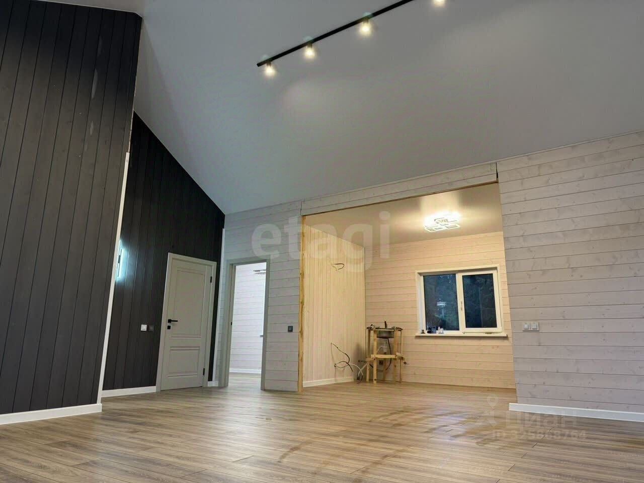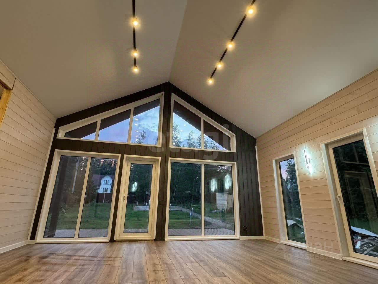 Планировка включает две спальни, просторную гостиную, большую кухню и мансардный этаж площадью 17 кв. м. Высокие потолки (5 м) и панорамные энергоэффективные окна от REHAU создают ощущение простора и наполняют дом естественным светом. Все коммуникации подключены: электричество (15 кВт), вода из собственной скважины, канализация — септик на 5-6 человек. Дополнительные преимущества — теплые полы, продуманная разводка электрики и качественная внутренняя отделка имитацией бруса с заводской покраской.