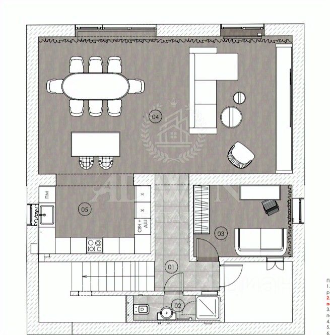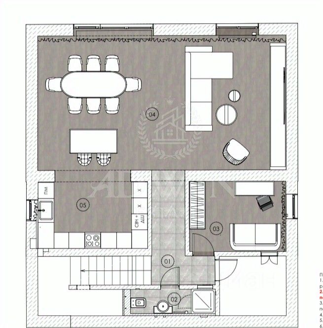 1 этаж- кухня-столовая-гостиная, спальня/кабинет, с/у, бойлерная-построчная.