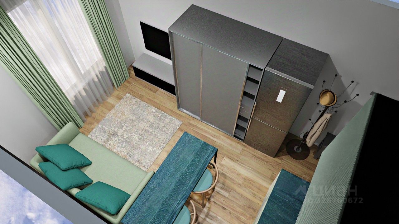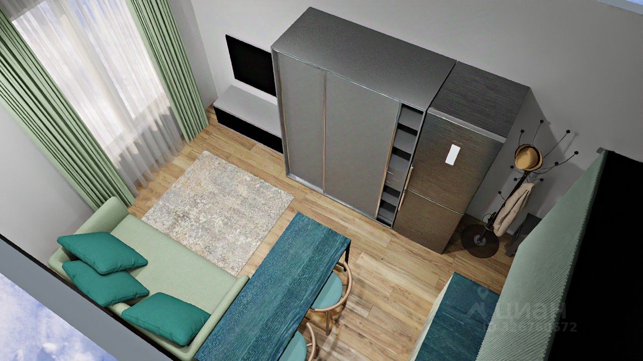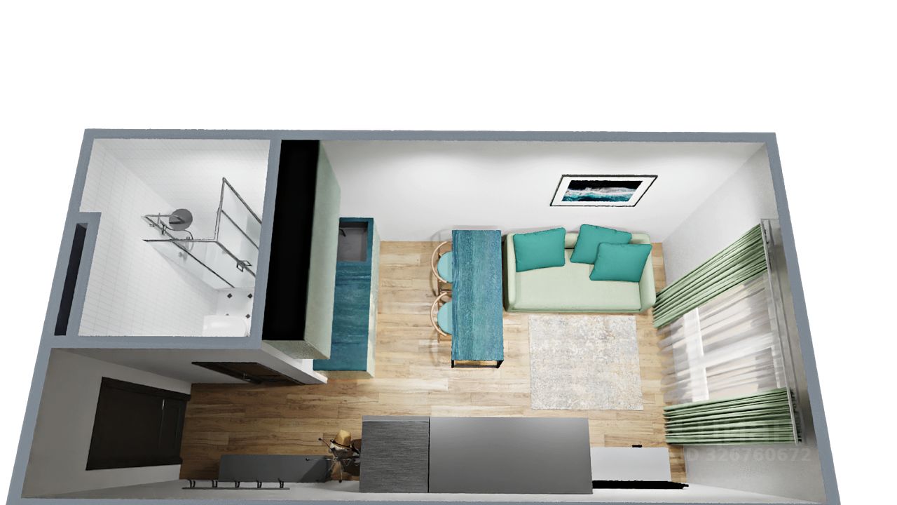 Дизайн в комнате можете воплотить по своим желаниям, прилагаю как пример дизайн в 3D графике (все точно по реальным размерам студии !!!)