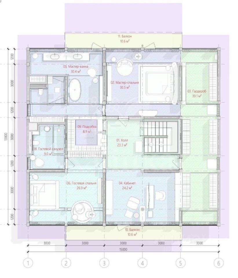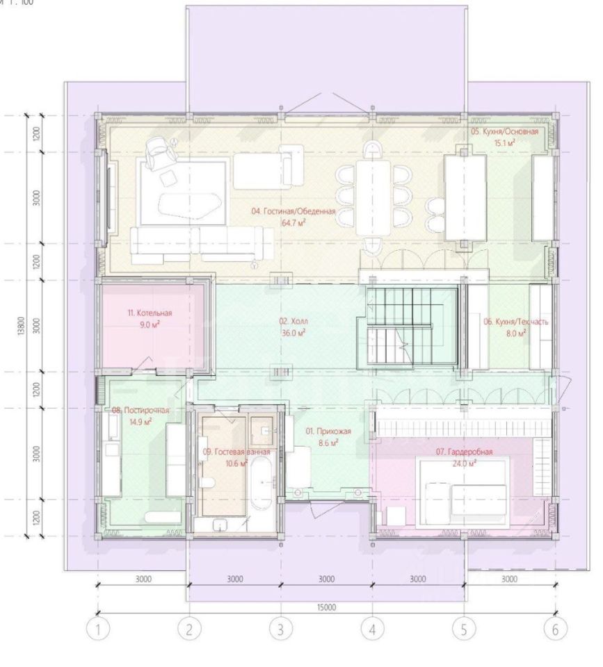 Планировка дома: 1 этаж: прихожая, гардеробная, с/у, постирочная, котельная, холл, гостиная, кухня, столовая, рабочая кухня. 2 этаж: холл, мастер-спальня с с/у и гардеробной, кладовая, кабинет, гостевая спальня с с/у.