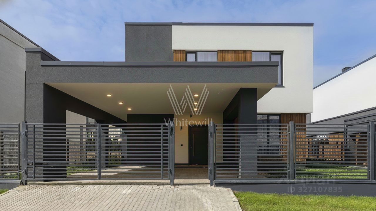 Новорижский. Двухэтажный коттедж площадью 300 м² расположен на полевом участке 7 соток. Фасад здания отличается строгостью форм и современным дизайном. Темные тона эффектно сочетаются с текстурой дерева, а панорамное остекление подчеркивает гармонию практичности и визуальной выразительности. Интерьеры выполнены в минималистичном стиле с использованием высококачественных материалов.
