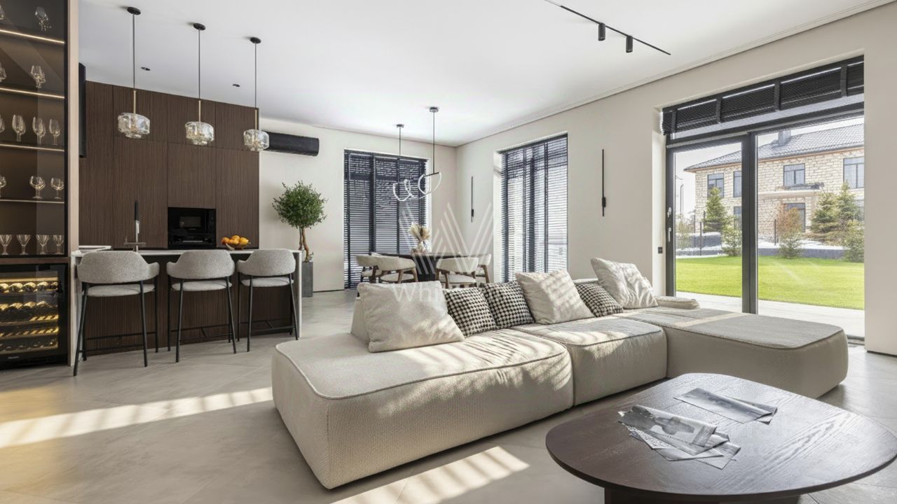 Лаконичная отделка и продуманное освещение делают пространство светлым и воздушным. На полу уложены покрытия с ёлочным узором и керамогранит, а стены оформлены деревянными панелями и штукатуркой. Мебель от ведущих европейских фабрик в нейтральных оттенках дополняет концепцию стиля, обеспечивая комфорт и функциональность.