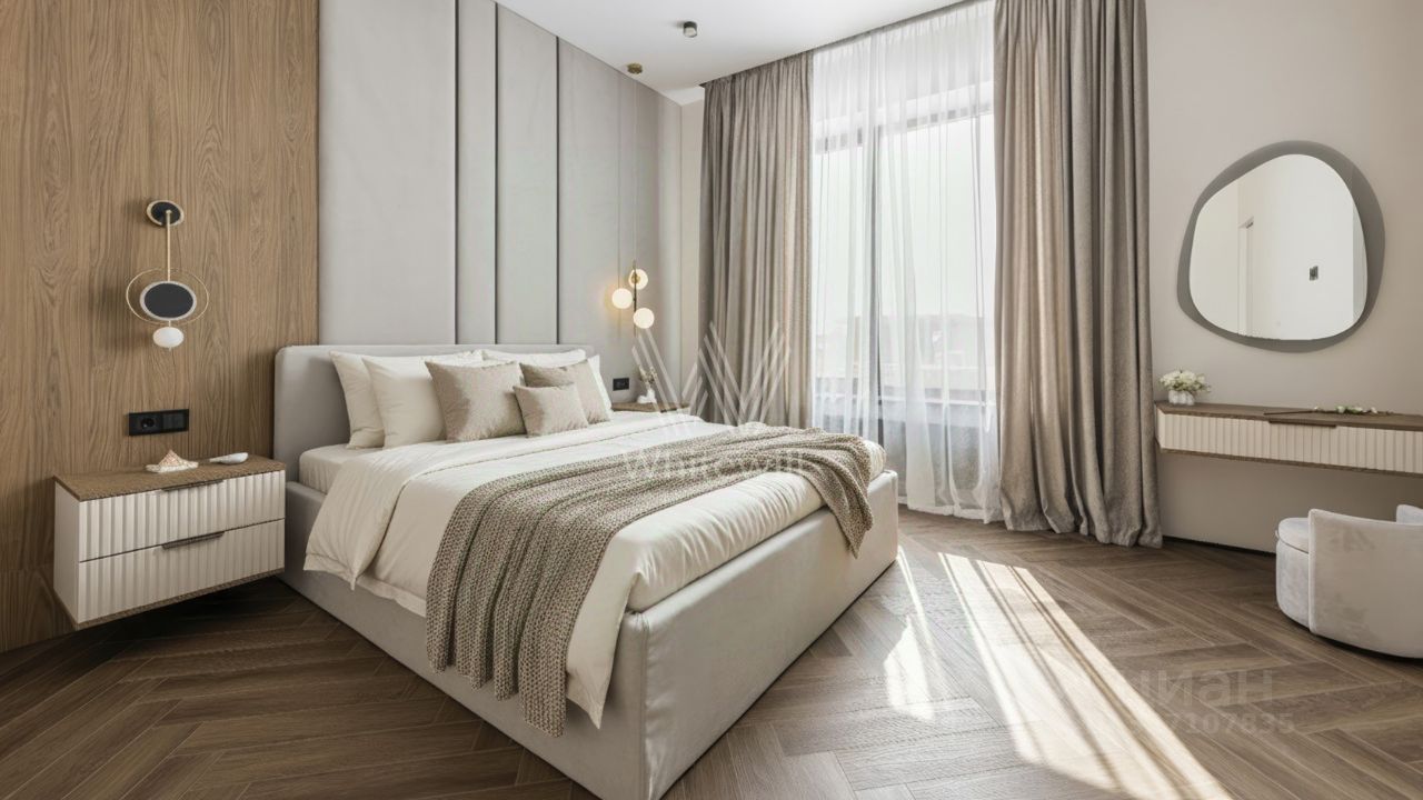 Лаконичная отделка и продуманное освещение делают пространство светлым и воздушным. На полу уложены покрытия с ёлочным узором и керамогранит, а стены оформлены деревянными панелями и штукатуркой. Мебель от ведущих европейских фабрик в нейтральных оттенках дополняет концепцию стиля, обеспечивая комфорт и функциональность. Дополнительно при реализации проекта предусмотрено большое количество мест для хранения вещей.