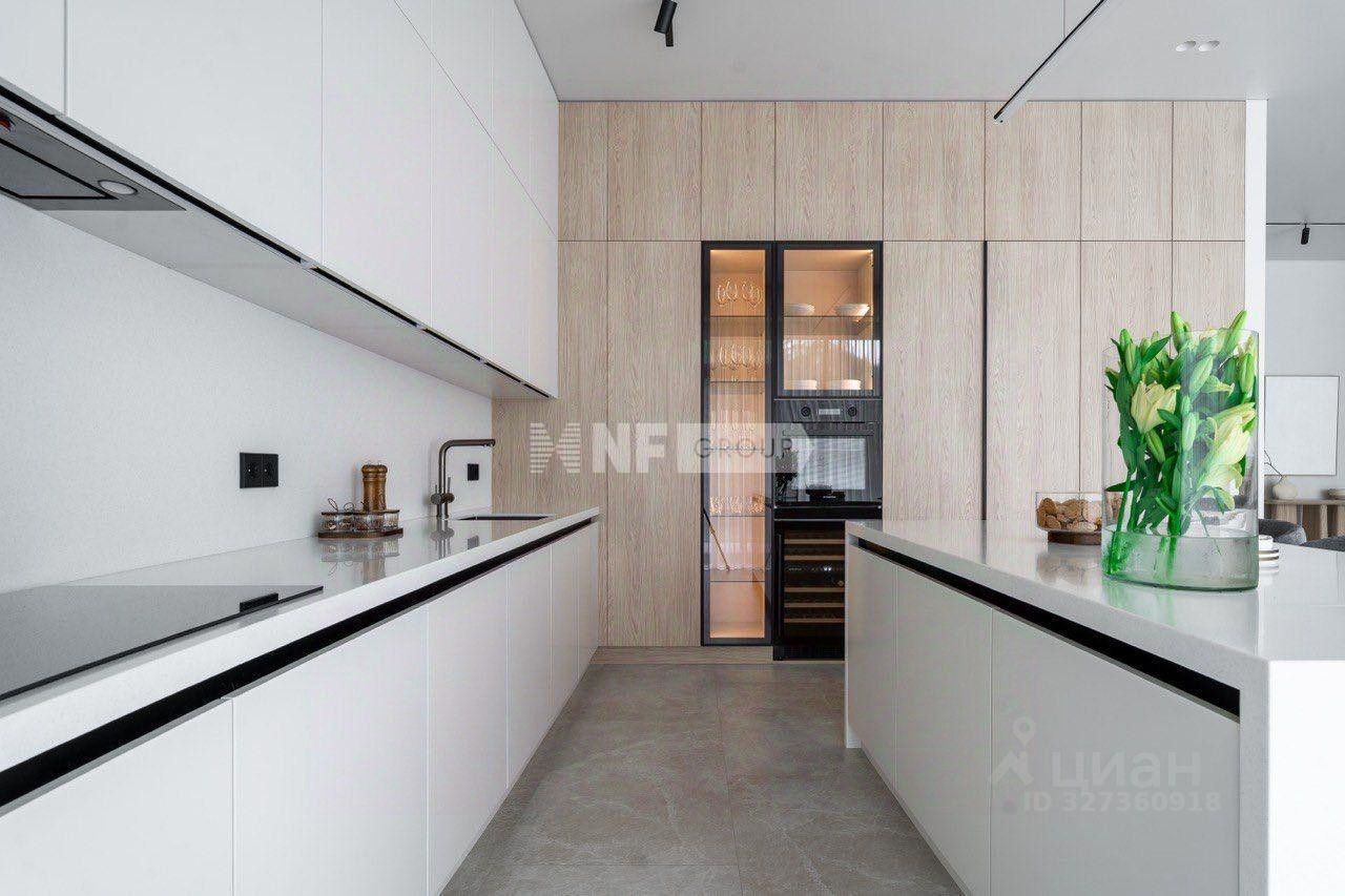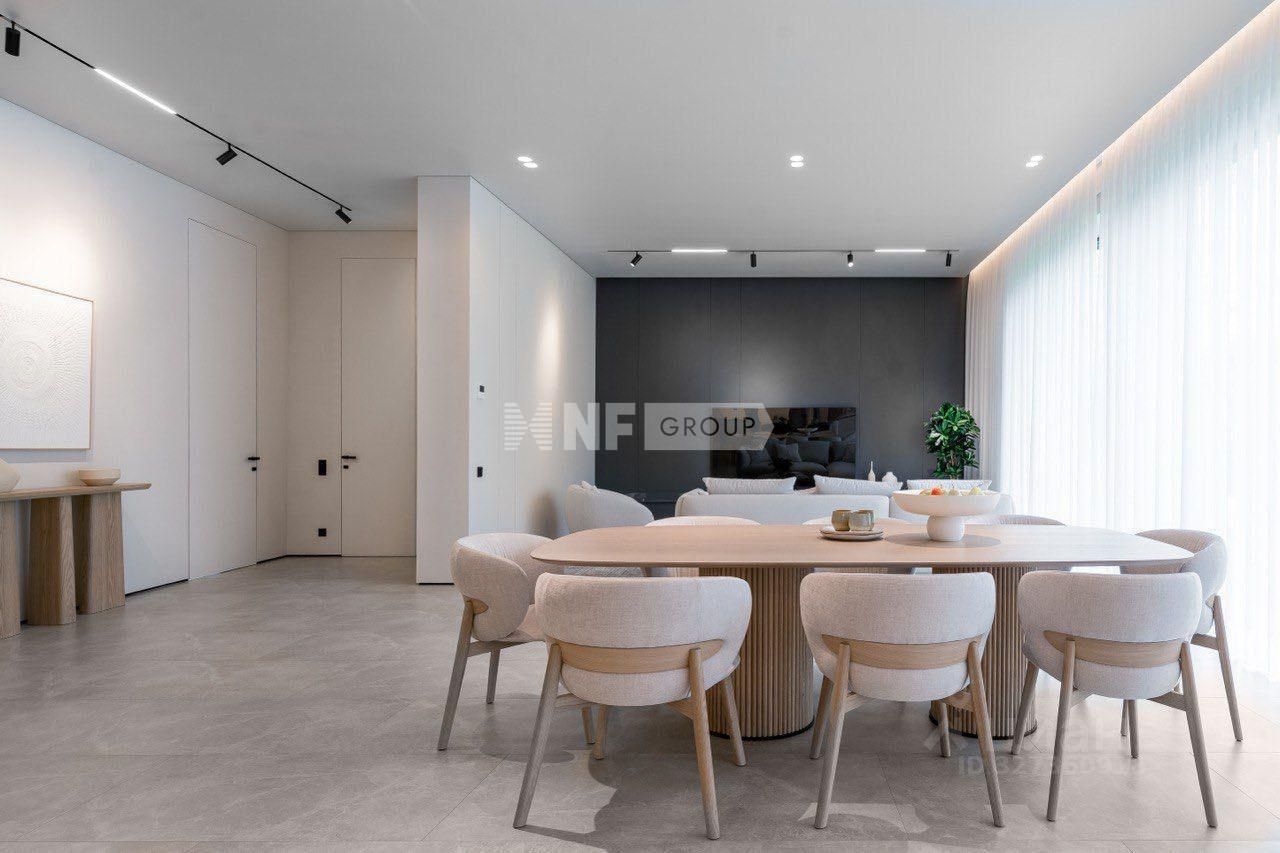Архитектурные особенности: конструктив и стилистика виллы продиктованы ландшафтом, чёткие линейные формы, панорамные окна, философия избранности, множество функциональных зон. Экстерьер: планкен из лиственницы, декоративная штукатурка Murexin, композитные панели Alucobond, фундамент — монолитная плита (срок службы до 100 лет), стены из тёплой керамики Porotherm. Инженерные системы: панорамное остекление Alutech (тепло- и шумоизоляция), система отопления с конвекторами Eva и котлом Baxi Slim, современное освещение с настройкой режимов, трубы из сшитого полиэтилена (выдерживают до 130C), IP-домофония Dahua с видеонаблюдением. Интерьер: керамогранит с тёплым полом на первом этаже, модульная мебель BoConcept в песочно-бежевых тонах, светлая гостиная с чилаут-зоной, контрастная стена с TV, контурная подсветка. Концепция: Villa Harmonia — метафора безмятежности и спокойствия, лаконичный дизайн, панорамные окна, высокие потолки, ощущение свободы и эстетики.